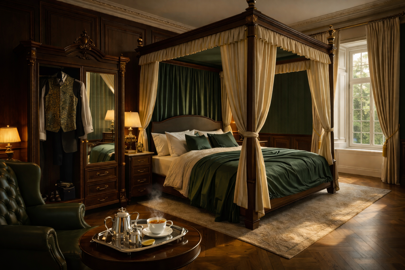 A room kept from the world. The curtains are open—but only barely. Silver on a tray, tea still breathing, and the quiet of a house that never rushes.